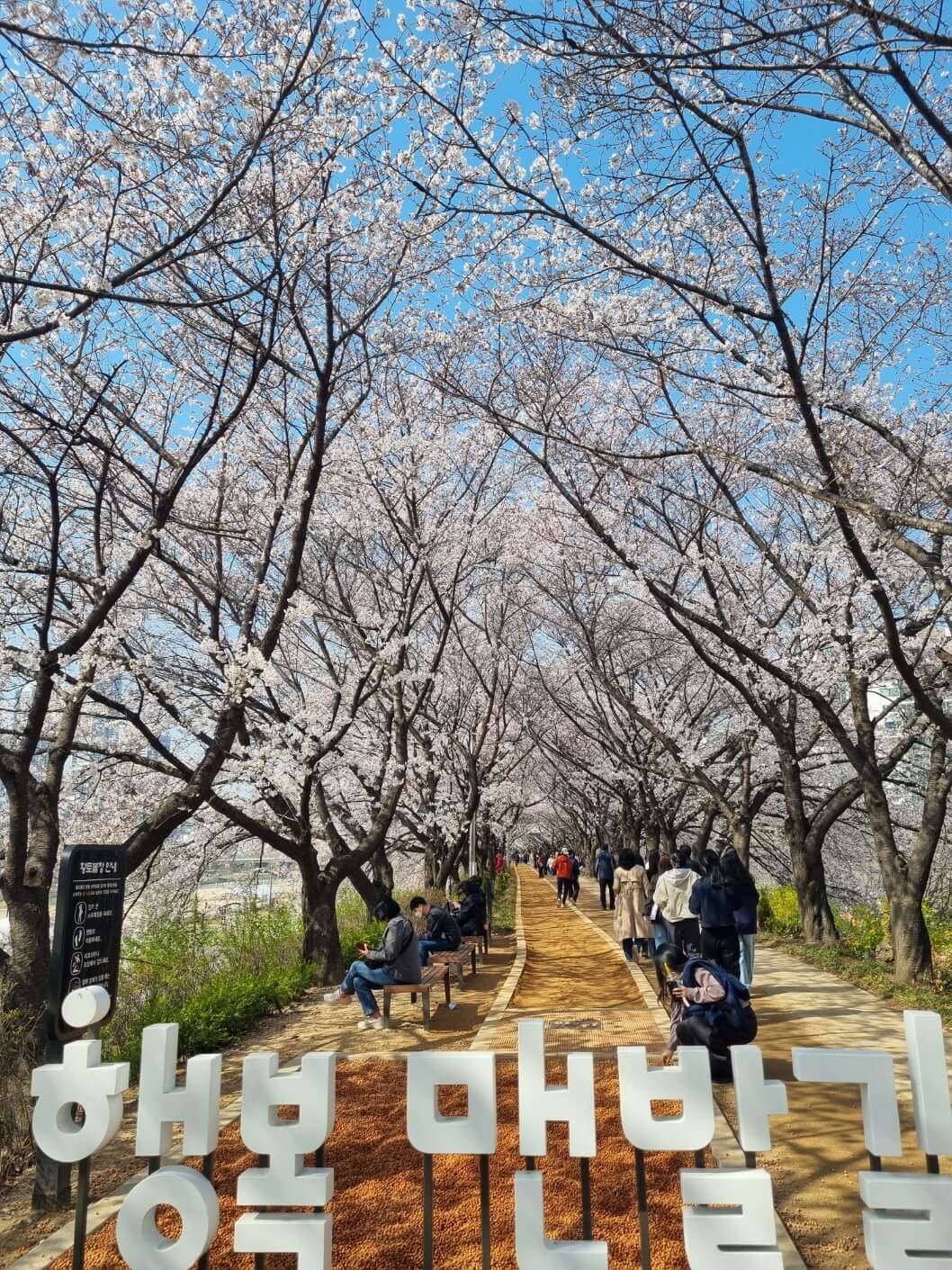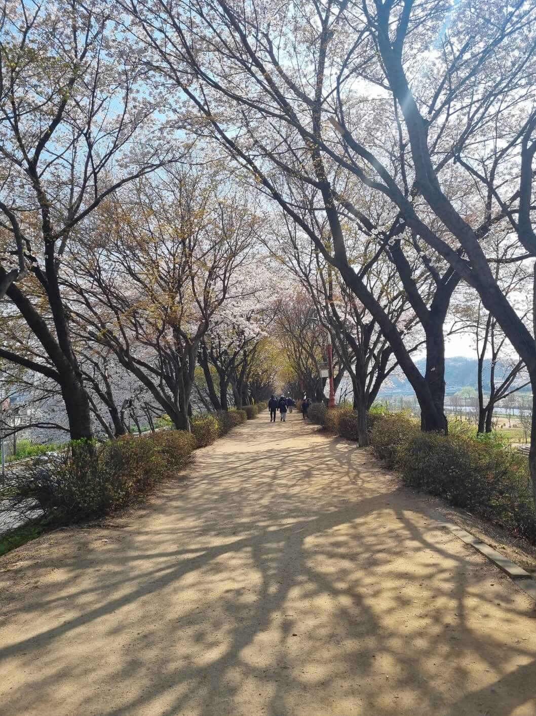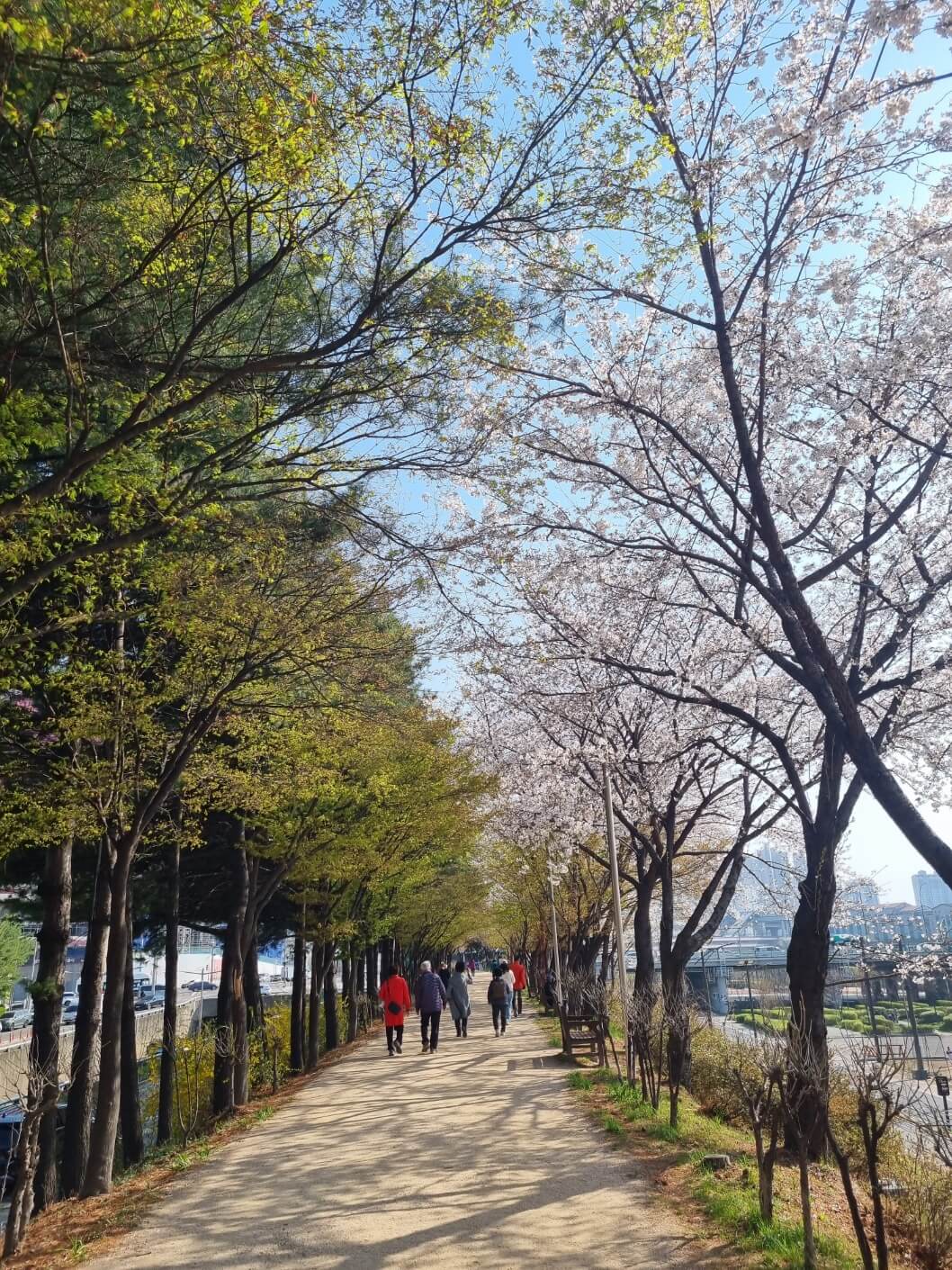 본래 이곳 벚꽃이 터널을 이루면 하늘이 온 통 꽃들만 보였는데 이번에는 꽃이 아직 덜 핀 건지 아직 그정도는 아니었지만 여전히 꽃은 예뻤고, 맨발 걷기 할 수 있는 황토 길도 만들어져 있어서 맨발로 하는 꽃구경도 즐거웠어요.