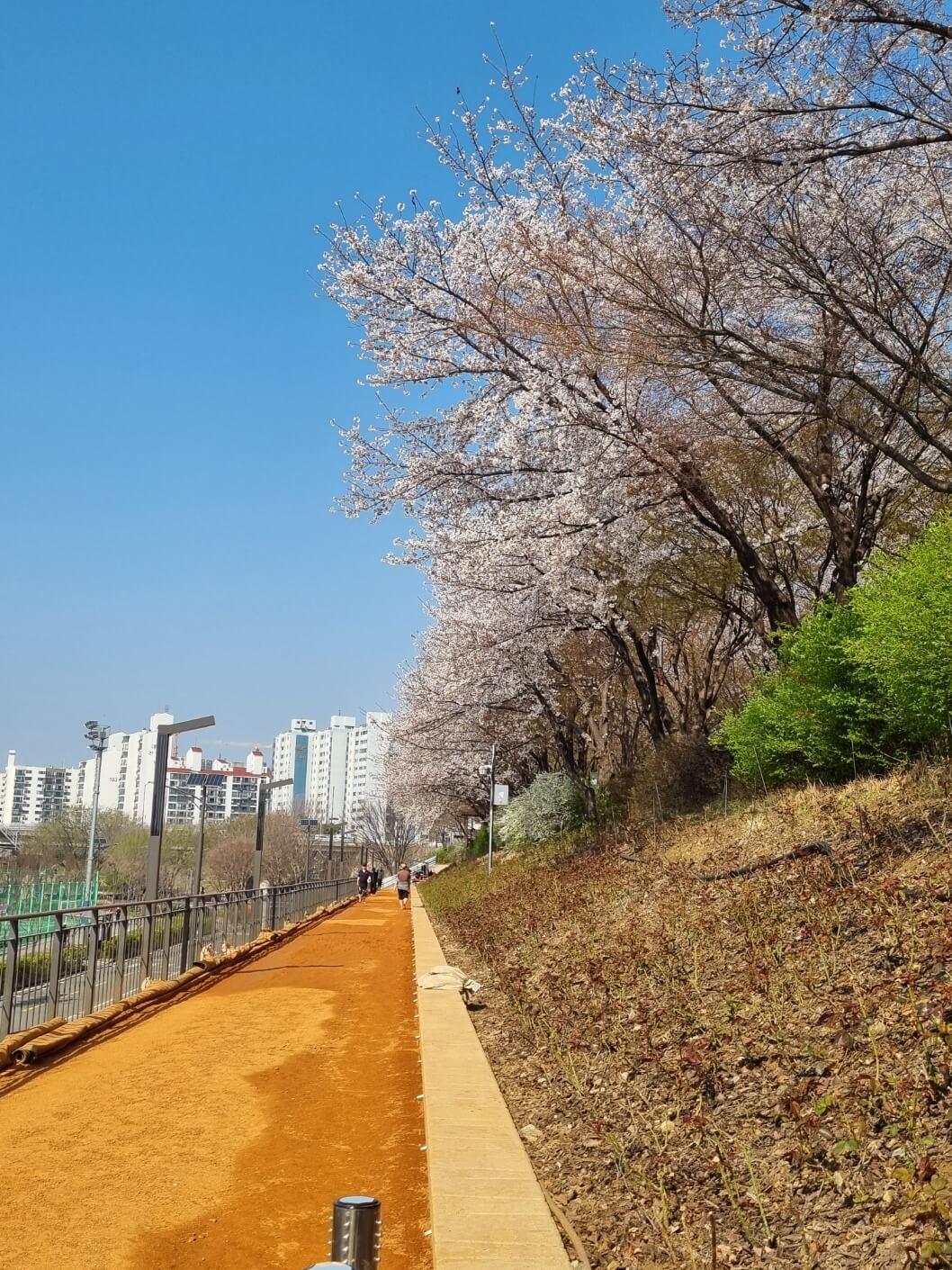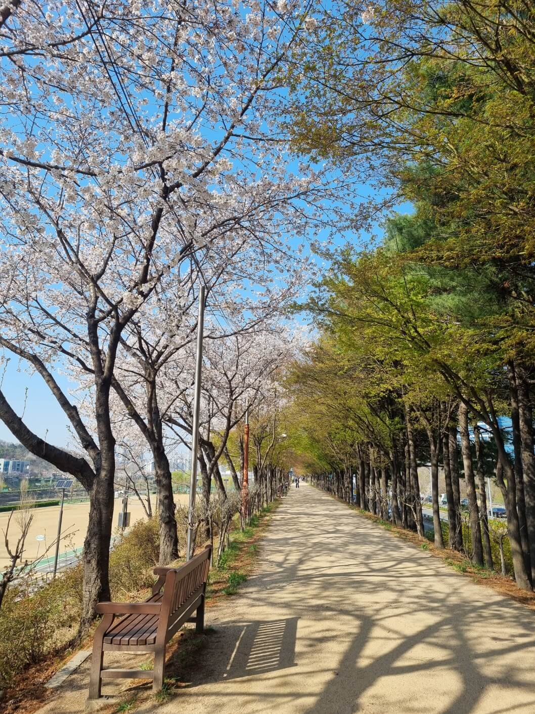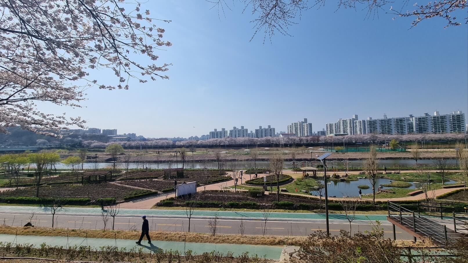 본래 이곳 벚꽃이 터널을 이루면 하늘이 온 통 꽃들만 보였는데 이번에는 꽃이 아직 덜 핀 건지 아직 그정도는 아니었지만 여전히 꽃은 예뻤고, 맨발 걷기 할 수 있는 황토 길도 만들어져 있어서 맨발로 하는 꽃구경도 즐거웠어요.